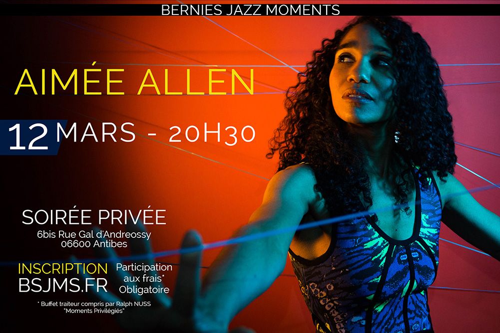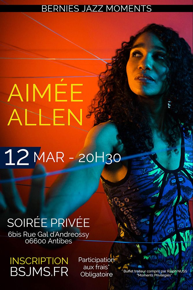 // Chanteuse américaine, basée à New York apporte sa voix chaleureuse et ses compositions uniques et éclectique, inspirées de jazz, bossa, bop et soul. Son album Wings Uncaged, nommée un "Best of 2019" dans Downbeat Magazine, est une collection de compositions et standards qui parlent des bêtes aux ailes, à l'aide des rythmes prenant et des harmonies surprenantes. Le tout est émouvant. Elle sera accompagné par le fameux duo des frères Moutin, batteur extraordinaire Louis et bassiste hors-pair François, ainsi que jeune pianiste de renom Karim Blal. Polyvalente, on peut s'attendre à des sélections en anglais, français et portugais. Comme disent les critiques, "la voix suave et soul d'Aimée Allen est à découvrir.".